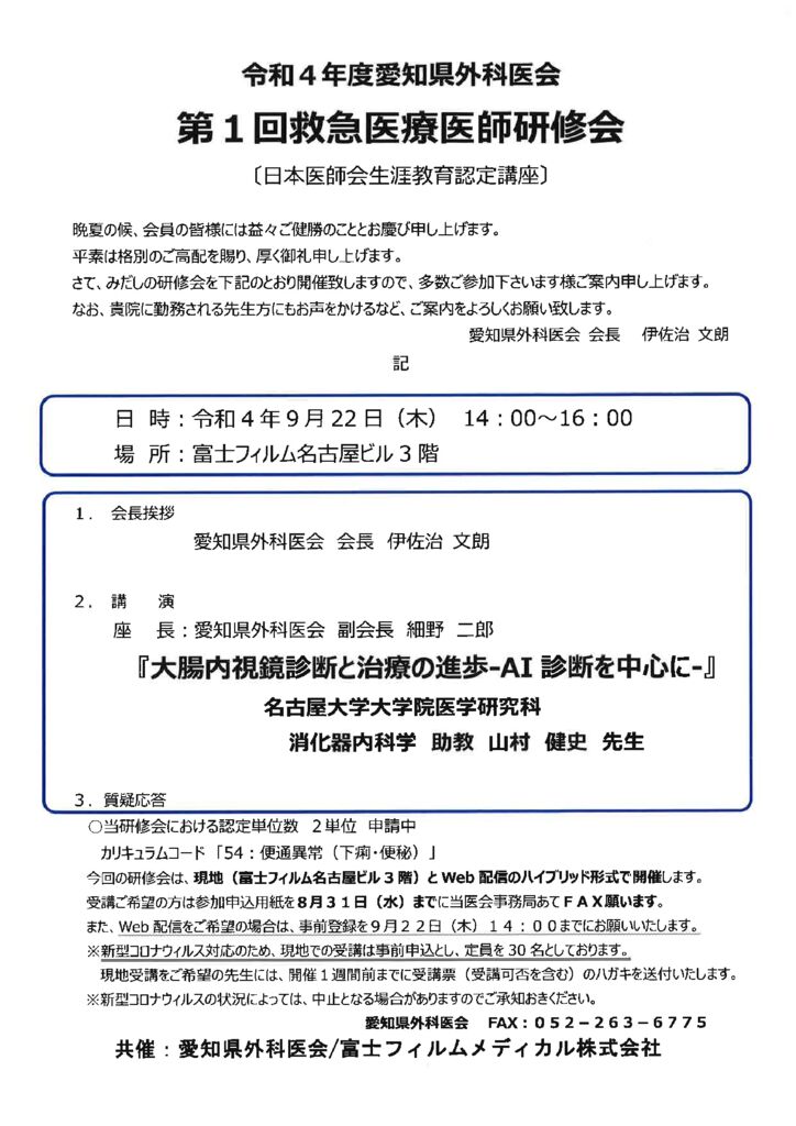 すでにホームページでお知らせしています11月28日(木)に開催いたします愛知県外科医会第2回救急医療医師研修会は 現地受講及びWEB受講のハイブリッド方式で開催いたします。 現地受講の事前申込みの締切りは過ぎていますが、 …