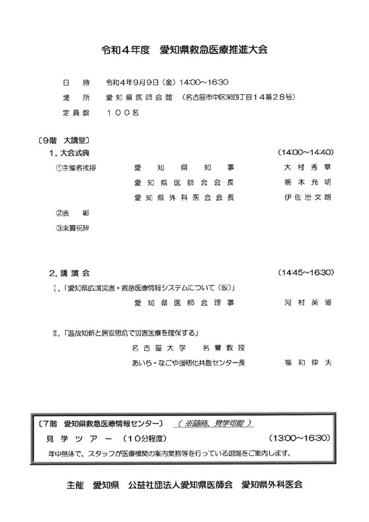 申込み締切日は9月10日(火)です。 すでにご案内しています、9月26日(木)午後2時からホテルメルパルク名古屋で開催いたします第1回救急医療医師研修会現地会場につきましては、まだ定員までに余裕がありますので、下記をダウ …